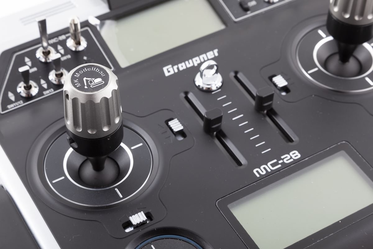 Präzise Modelle benötigen eine präzise Steuerung. Dieser Präzisionssteuergeber aus CNC bearbeitetem Aluminium ist farbig eloxiert und besitzt eine hervorragender Haptik. So macht das Steuern von Radladern, Baggern und schweren Maschinen viel Spaß!