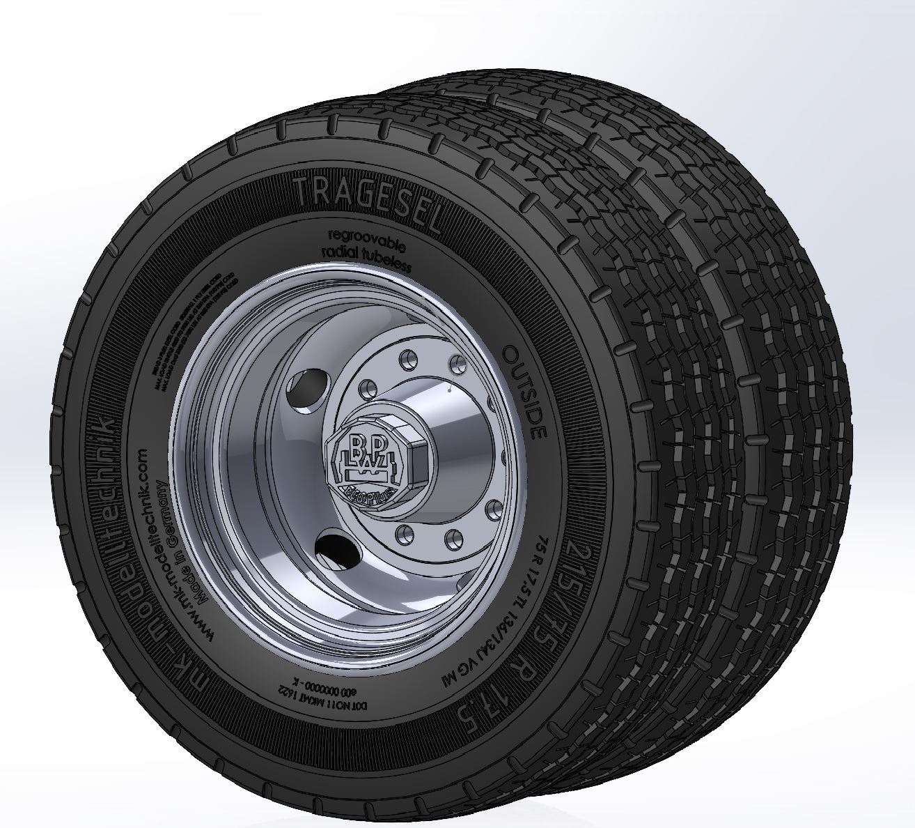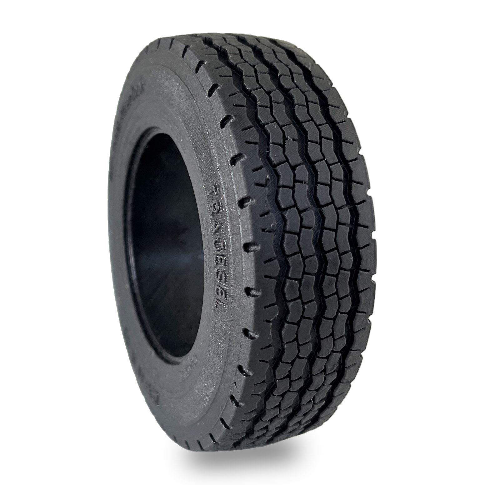 Der Reifen hat einen Durchmesser von 102,5 mm und eine Breite von 32 mm. Da unsere Tiefladerfelge zerlegbar ist, wird die Montage von Vollgummireifen durch einen abnehmbaren Distanzring enorm erleichtert. Das Profil auf der Lauffläche hat einen hervorragenden Halt auf Asphalt sowie Grip auf feinem Schotter. Die Vorderseite des Reifens ist fein detailliert, die Rückseite dagegen glatt ohne Schrift, da sich hier Anguss und Steiger befinden. Der Reifen besteht aus einer äußerst robusten Polyurethan-Mischung und ist fein detailliert beschriftet.