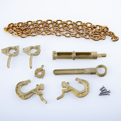 Die Gussteile bestehen aus einer hochfesten Messinglegierung und sind mechanisch belastbar. Die feinen Reliefschriften sind exakt dem RUD Original nachgebildet. Die beiden M4 Gewindestangen sind aus Edelstahl, die Zurrkette aus Messing gefertigt. Die Kettenglieder sind verlötet. Die Bruchlast der Kette liegt bei erstaunlichen 40 Kg.