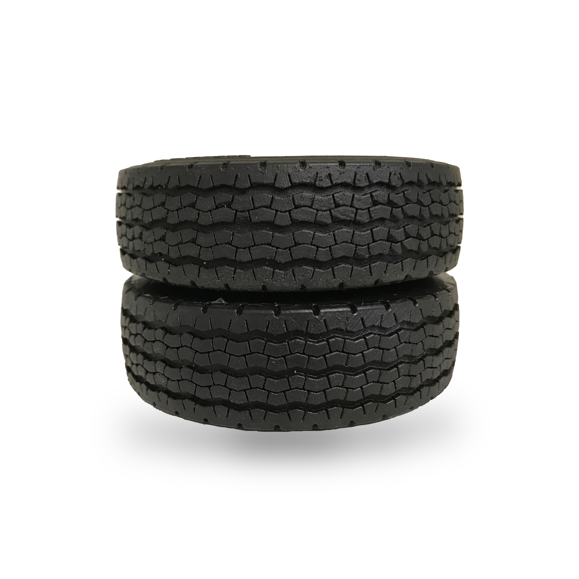 Der Reifen hat einen Durchmesser von 102,5 mm und eine Breite von 32 mm. Da unsere Tiefladerfelge zerlegbar ist, wird die Montage von Vollgummireifen durch einen abnehmbaren Distanzring enorm erleichtert. Das Profil auf der Lauffläche hat einen hervorragenden Halt auf Asphalt sowie Grip auf feinem Schotter. Die Vorderseite des Reifens ist fein detailliert, die Rückseite dagegen glatt ohne Schrift, da sich hier Anguss und Steiger befinden. Der Reifen besteht aus einer äußerst robusten Polyurethan-Mischung und ist fein detailliert beschriftet.