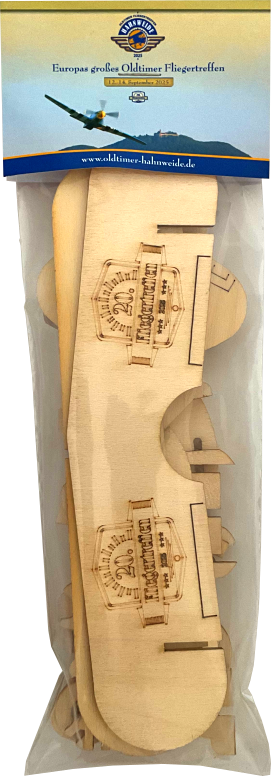 Steckbausatz des Doppeldeckerstandmodells aus Holz mit gelasertem Logo des Oldtimer Fliegertreffens 2025 auf der Hahnweide.