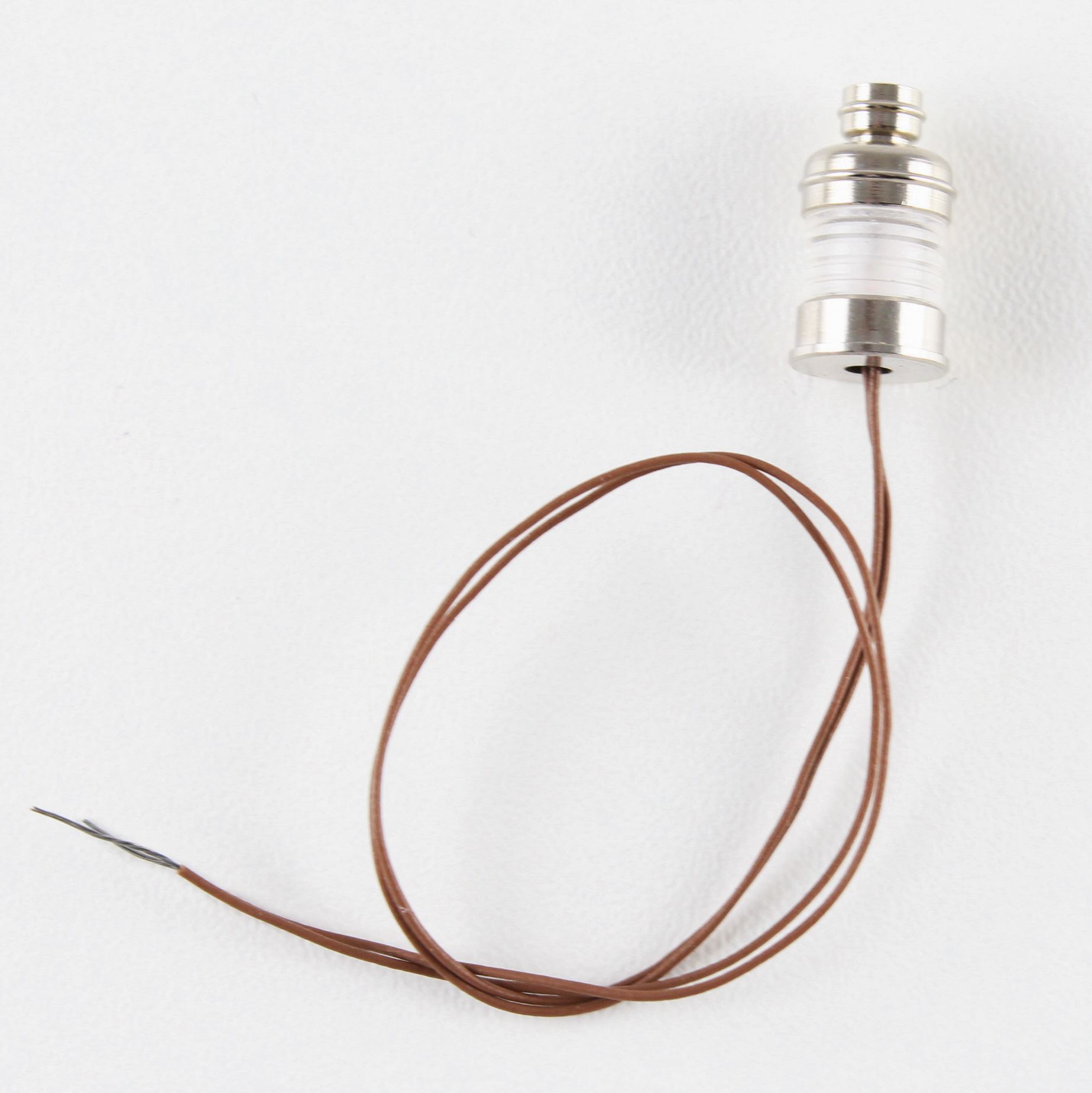 Rundumlaterne mit transparentem Glas (Acryl). Boden und Deckel aus Messing vernickelt. Mit Leuchtmittel. Spannung 3 Volt / 100 mA. 2-adrige Anschlussleitung, Länge ca. 10 cm.